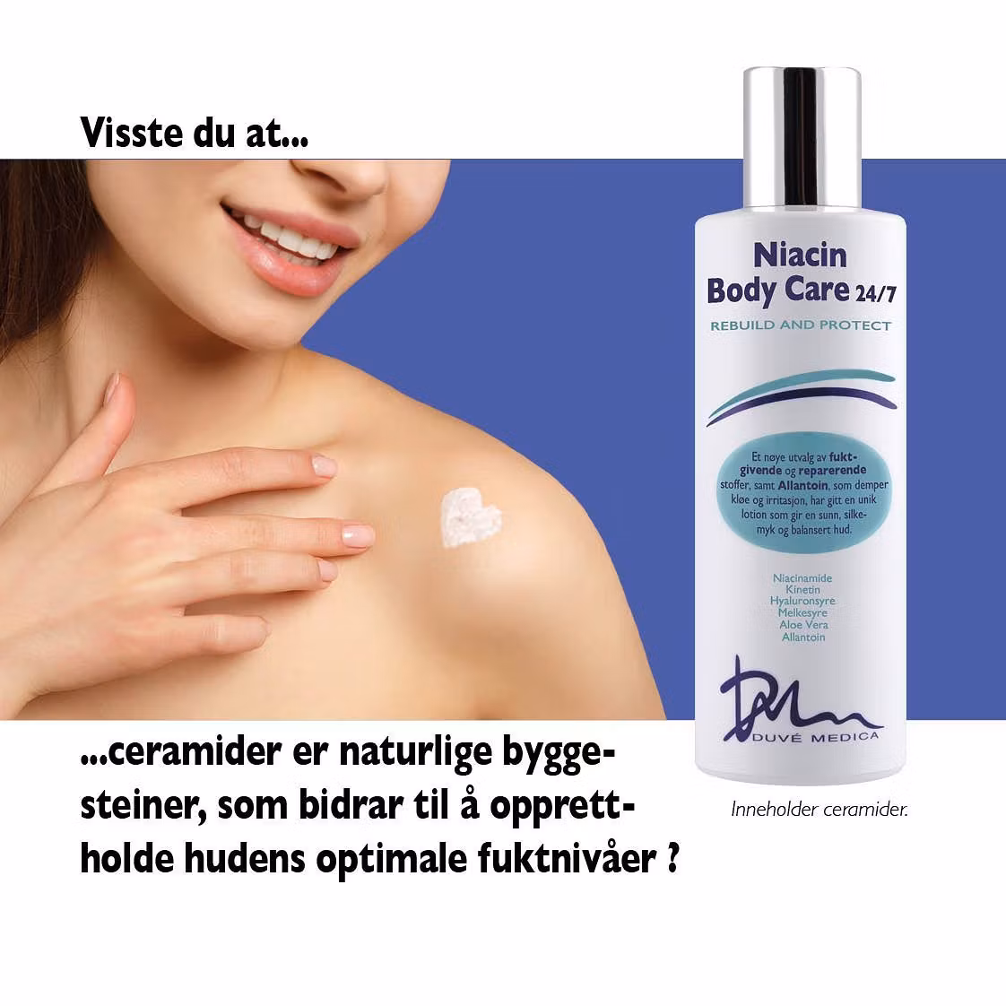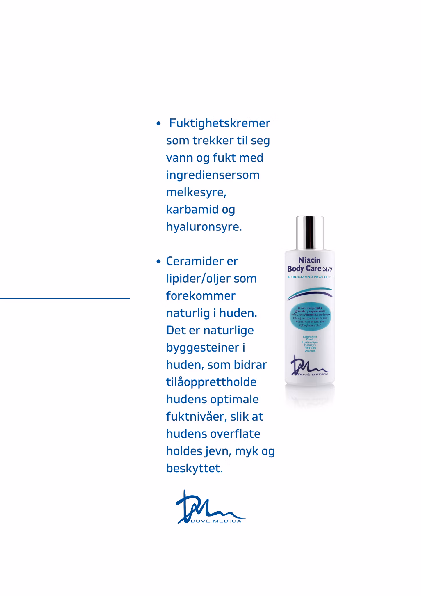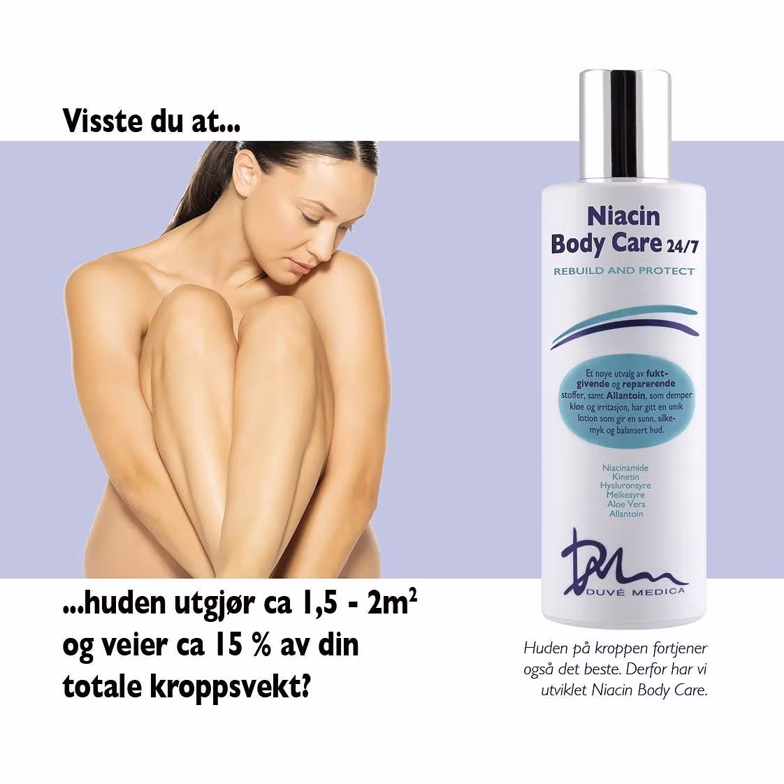 I Niactin Body Care er det benyttet to av de mest vanlige behandlingsprinsippene for å få en umiddelbar og gjennomfuktet effekt og dels for å få huden til å reparere seg selv. Et nøye utvalg fuktgivende, beroligende og reparerende stoffer, samt Allantoin, som demper kløe og irritasjon, har gitt en unik lotion, som jobber 24/7 for å gi deg en sunn, silkemyk og balansert hud. En bodylotion med akkurat det huden på kroppen trenger.